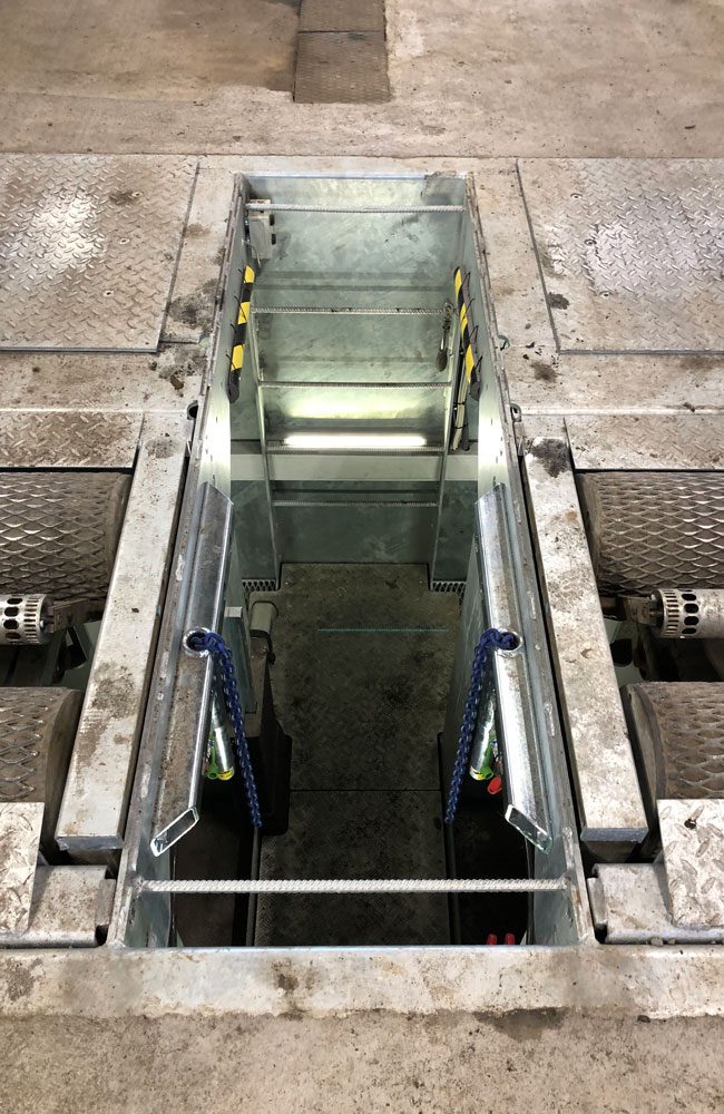 Komplet galvaniseret stålgrav til Bremsetester og Slitagetester med trappenedgang fra siden og hydraulisk aluminiumslåg. BM65 Præfabrikeret stålgrav er en hurtig, enkel og løsning med lave omkostninger ved installation indendørs hhv. udendørs.